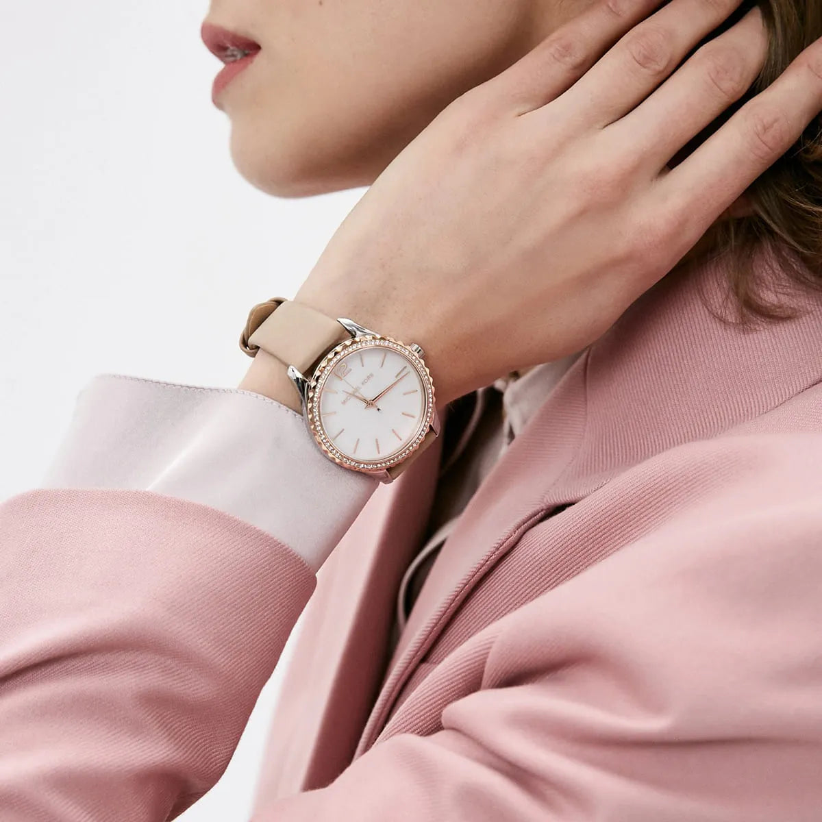 Le point focal de la MK2910 est son magnifique cadran en nacre (Mother of Pearl) blanche, offrant des reflets irisés uniques à chaque angle. Le cadran est sublimé par un cercle de cristaux pavés et des index en chiffres romains dorés roses, apportant une brillance subtile mais luxueuse. Son boîtier de 38 mm en acier inoxydable or rose offre une silhouette élégante et intemporelle.